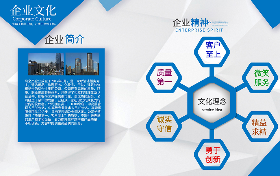 公司是一家以清潔服務(wù)為主,旅游,干洗、化妝品、裝修和餐飲相結(jié)合的多元化發(fā)展運(yùn)營的服務(wù)性企業(yè)。企業(yè)本著誠信第一、服務(wù)至上的原則,依靠公司盡我所能、力我所及的信條從2012年到現(xiàn)在服務(wù)了多家企業(yè),現(xiàn)在我們已經(jīng)擁有了400家左右的清潔服務(wù)項目和多家洗衣店。我們會一直牢記服務(wù),創(chuàng)新才是我們企業(yè)發(fā)展的服務(wù)宗旨。